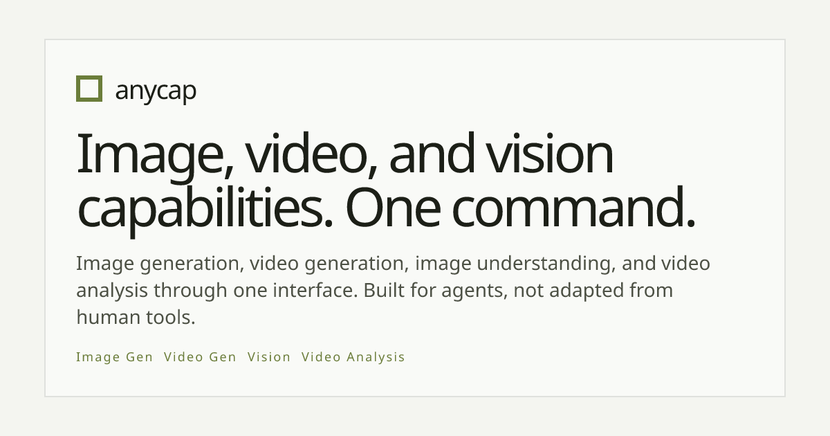 | Video generation | No video tooling in terminal loop | Create walkthroughs and clips via anycap video generate | Video Generation page |